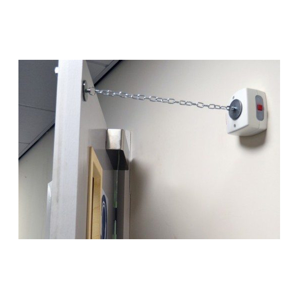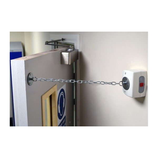 The chain keeper enables a wall mounted electromagnetic fire door holder to be used, even when the door will not open fully to meet the magnet.