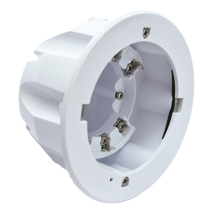The Soteria Dimension Mounting Box is moulded from white flame-retardant polycarbonate. Positions for either side or top cable entry are marked on the outside of the Mounting Box to ensure correct cable positioning. An arrow has been placed on the rim to assist in correct orientation of the detector. Placing the Mounting Box in the correct orientation in the installation aperture, it is secured into position by screwing down the self-aligning fixing tabs.