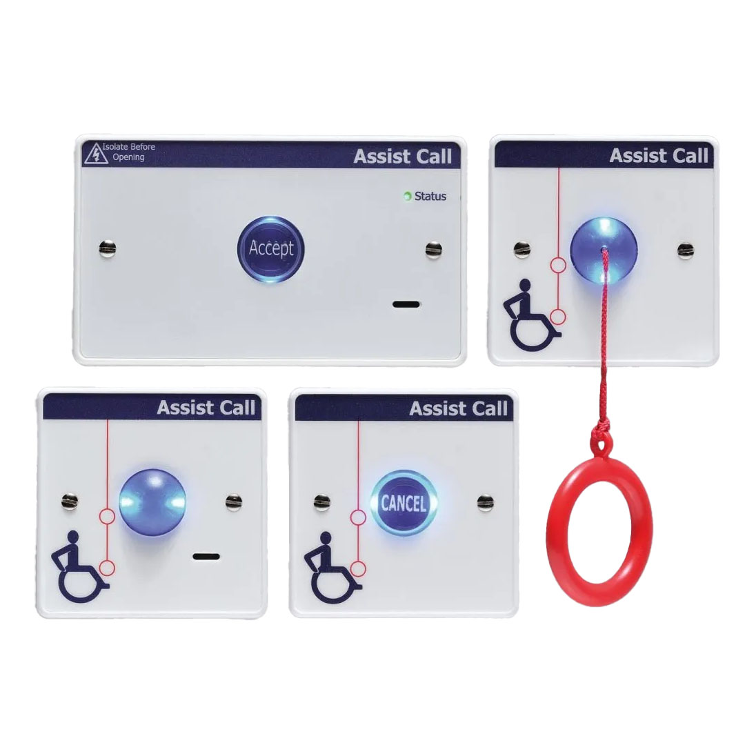 The Vox Ignis AssistCall Remote WC Alarm Kit White version (ViAC-RTK-W) provides a complete standalone emergency assistance alarm system specifically designed for accessible toilet facilities. This comprehensive kit includes all components required for a single emergency assistance alarm system, consisting of a ViAC-1ZC-W 1-zone controller, ViAC-CPP-W pull cord, ViAC-CNP-W cancel button and ViAC-ODP-W over-door indicator.