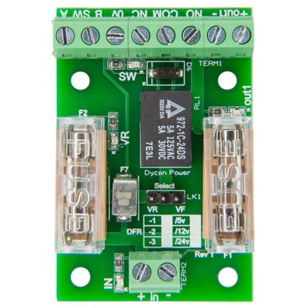 Dycon’s universal relay output module range consists of two models, DFR-1-12, a 12VDC unit and DFR-1-24, a 24VDC version. A DFR-X relay board switches the output power if the input is closed or opened. Like a fire relay, the input can be triggered from a switch, using the internal power or by applying 12 or 24 Volts DC depending on version and have the ability to control up to 5 Ampere loads. The relay is switched through an opto-coupled input that provides full isolation and uses very low power to switch the relay. Normally-open and normal-closed contacts enable operation in power-fail mode. The unit has 2 outputs, one switched and one pass through, both of which are individually fused. The integral jumper enables the relay to be set to volt free operation. 4 LED’s provide easy feedback of the status of the inputs and outputs. The DFR-X units have the same footprint and fixing positions as the Dycon DFX4-0P 4-way output splitters and can easily be fitted into a wide range of Dycon housings.