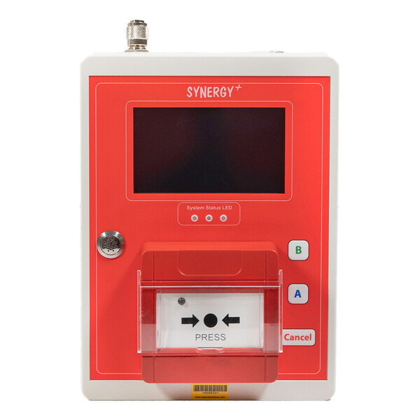 The Evacuator Synergy+ Base Station is a mains-powered emergency communication system with advanced features, including First Aid Call, Category One radio module, and Mesh Radio connectivity.