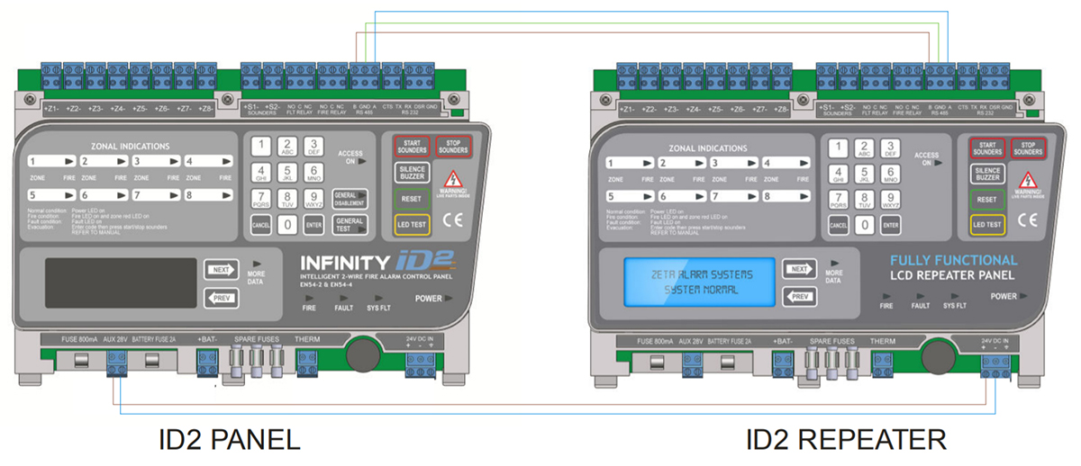 Yes it is possible to link two ID2 panels together. There are no inputs on-board the fire panel, so each panel will need to have a ZAIO-MI (I/O Unit) connected to the loop or zone radial depending on how you have wired the system and then given an address of a spare ID.