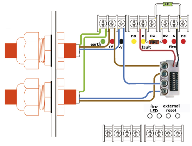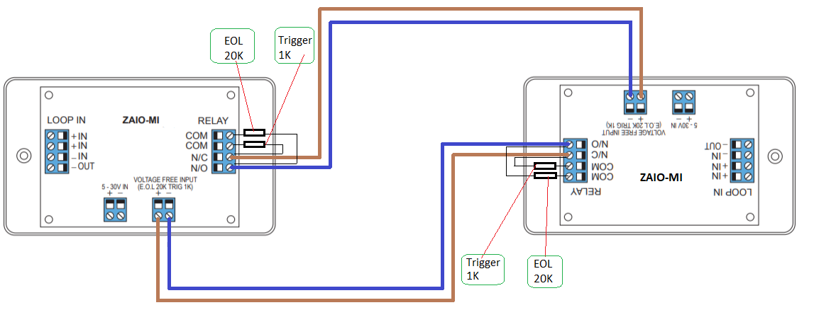 You will need to run two x 2 core and earth fire cables between the ZAIO-MI units. Please see diagram below for the connections between them.