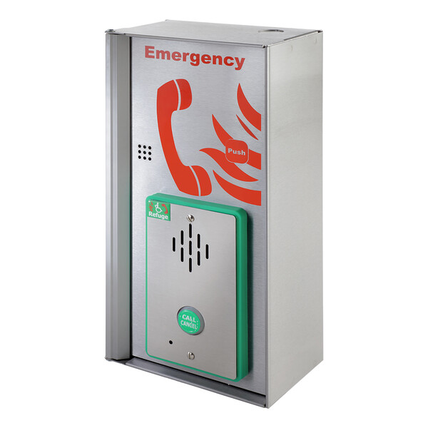 The outstation is supplied in a brushed stainless finish with a Type B refuge point on the front with a high contrast red screen print with a rugged red telephone handset behind the push door.