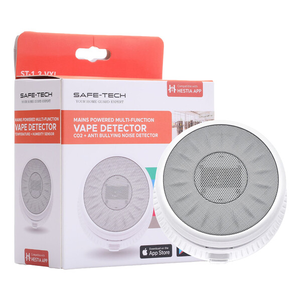 This multi-function vape detector by Safe-Tech provides comprehensive safety monitoring with advanced features and reliable backup power for uninterrupted operation.