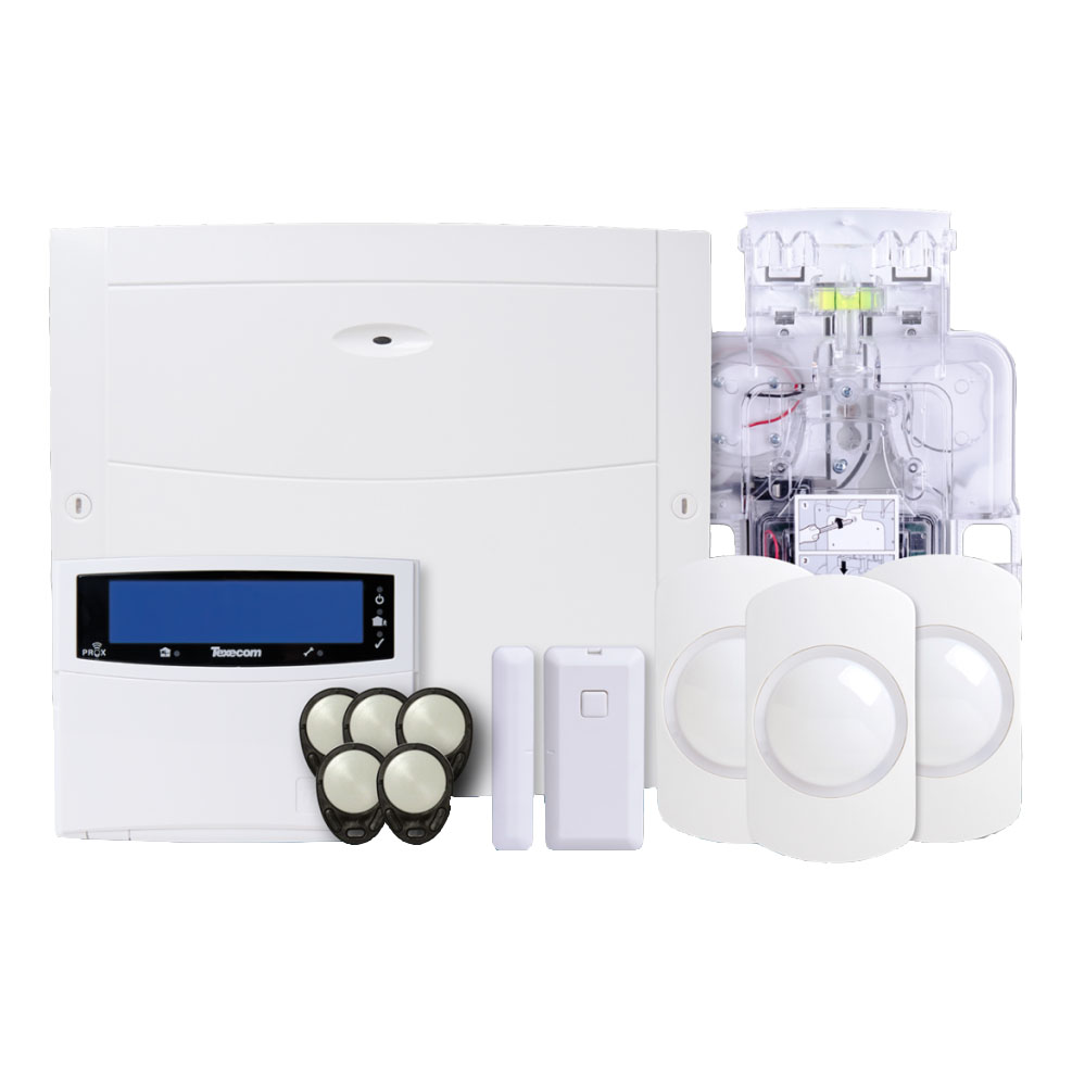 The Texecom KIT-1002 is a 64-zone wireless alarm kit featuring the Premier Elite 64-W panel. It includes a wireless keypad (Premier Elite LCDLP-W), three PIR detectors (Capture P15-W), a micro door contact, five proximity tags and a Odyssey X-W Backplate.