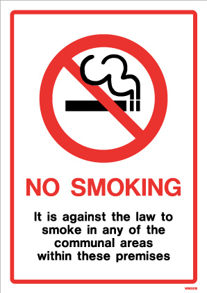 This No Smoking sign has been designed for use in communal areas. The text reads ‘No Smoking. It is against the law to smoke in any of the communal areas within these premises.’.
