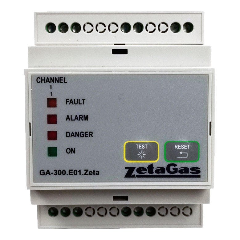 The Zeta Analogue Gas Controller (GA-300.E01/02/03/04) is designed to manage up to four gas detectors, providing reliable gas detection for non-ATEX areas such as kitchens and boiler rooms. This versatile controller features two alarm levels with LED indication and differential audible alarms, ensuring prompt notification of gas presence. It is equipped with a “TEST” mode for checking actuator conditions and a “RESET” mode that deactivates alarm relay outputs temporarily. The GA-300.E series is compatible with GA-220.BC.V gas detectors and offers easy installation with its DIN housing, making it an ideal choice for standard electrical switchboards.